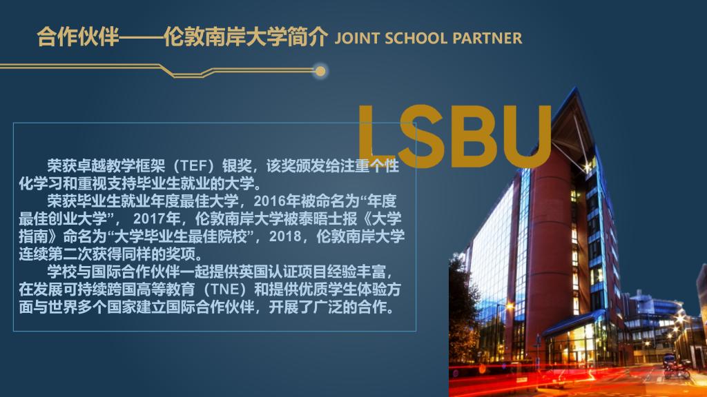 伦敦南岸大学 (London South Bank University,简称:LSBU) 是伦敦地区规模最大和历史最悠久的大学之一,地处伦敦市中心。自1892年以来,伦敦南岸大学拥有来自130多个国家的18000多名学生,为学生提供的教育始终与职业相关联,并获得职业机构及专业协会的认证。