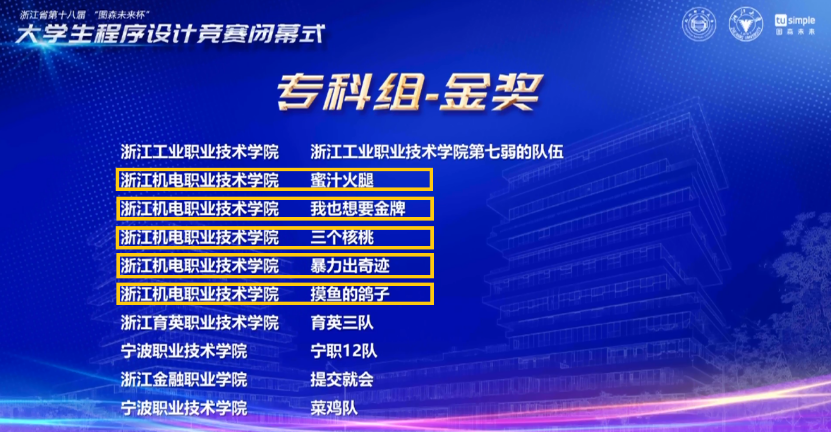 2021年4月17日,我校现代信息技术学院邹会来、张宪乐等教师指导的8支ACM队伍参加了浙江省大学生科技竞赛委员会主办的第十八届“图森未来杯”浙江省大学生程序设计竞赛,取得了5金3银的成绩!金奖数全省高职院校第一!创我校参加本赛事近15年以来的最好成绩!