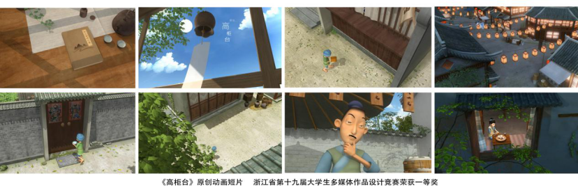 本次入围的决赛作品中,叶洲啸、王伊伦、曹婧、陈鑫伟、陈培侠、郑若男、叶柯辰、朱小毅、杜成科、蔡豪琦、黄凤麟、张培钦同学完成的三维动画作品《高柜台》(指导老师:朱冬勇、孙迪)荣获动画类作品一等奖;杨芝颖、鲍梦婷、林星同学完成的作品《诗画浙江说》(指导老师:钱伊娜、季海祺)荣获海报类作品一等奖;由林星、杨芝颖、鲍梦婷同学完成的海报作品《人文荟萃之浙江诗路行》(指导老师:钱伊娜、齐云龙)荣获二等奖;徐妮雯、竺贞贞同学完成的海报作品《人文诗路行》(指导老师:齐云龙、钱伊娜)荣获二等奖;钱露梦、陈卓珂、龚益宁、黄豪帆同学完成的作品《舟山舟渔》(指导老师:吴晓程、张玉青)荣获移动应用类作品一等奖;宋超杰、施冉萱、张衡拓、阙忠槿、常国万等同学完成的移动应用作品《梦里水乡》(指导老师:吴晓程、张玉青)荣获二等奖;在VR/AR开发类中由金瑞兴、秦冠豫、包宏、俞炯、温兰跃玲同学完成的作品《荆途逐鹿江南》(指导老师:陈晗斐、施兢蓉)荣获二等奖。