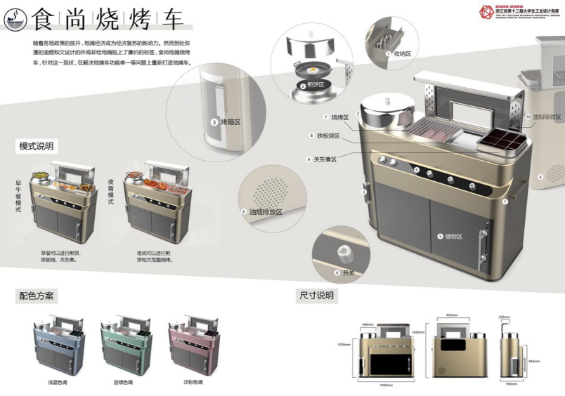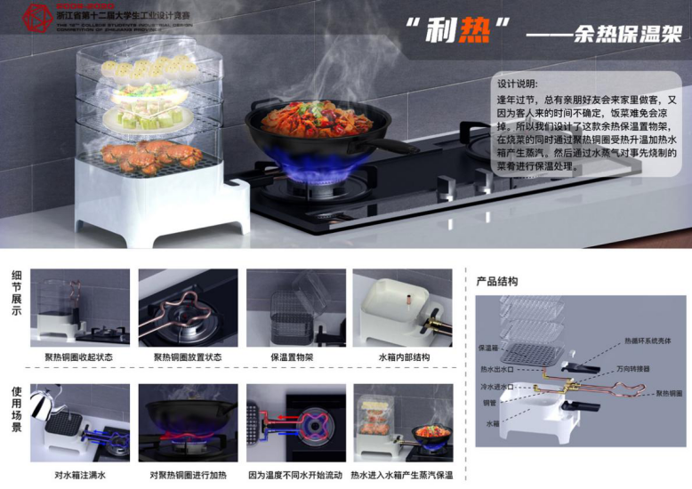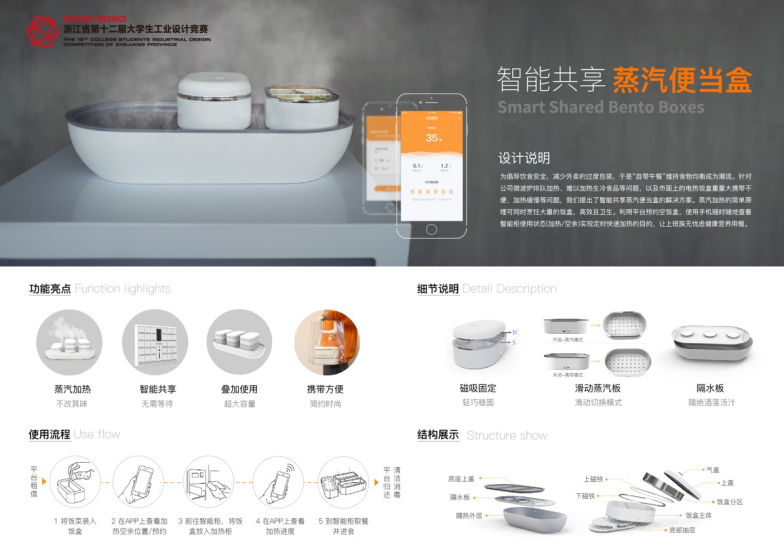 本次竞赛以“食”为竞赛主题,围绕饮食问题展开。在历时5个多月的时间中,我校师生积极备战,奋勇拼搏,最终,武凡老师指导的方可怡、王沁华、朱奇恩3名同学的《“食尚”——地摊烧烤车》,吴晓程老师指导的石文斌、王杰、刘方舟3名同学的《智能共享蒸汽便当盒》获得一等奖,许慧珍老师指导的沈童、张杰、顾家健3名同学的《“型随意动”多尺寸饮食保温器》,诸葛耀泉老师指导的赵亚峰、李嘉、李俊3名同学《“余温煲”》,诸葛耀泉老师指导的李小毛、王津、王慧3名同学的《"利热"-余热保温置物架》获得二等奖,尉锋老师指导的徐秉章 、宋超杰 、张晨旭 3名同学的《冷热皆宜饭菜宝》及其余4件作品获得三等奖。