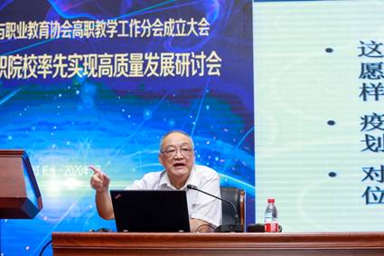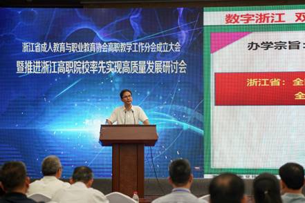 在随后进行的推进浙江高职院校率先实现高质量发展研讨会上,高职教学工作分会会长,浙江机电职业技术学院院长丁金昌作了“‘数字浙江 双高高职’推进浙江高职院校率先实现高质量发展”的主题报告,从新形势、新征程、新理念、新方位、新发展、新模式、新专业、新课程、新课堂、新成效十个方面提出了进一步推进高职院校高水平建设、高质量发展的新举措。
