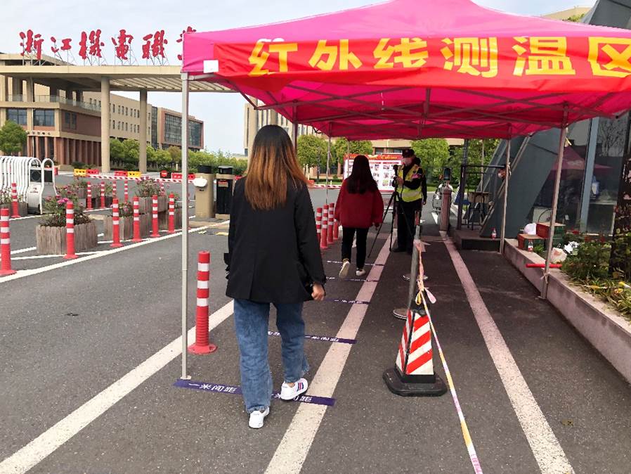 学生通过查看健康码及红外测温仪测温正常后有序入校