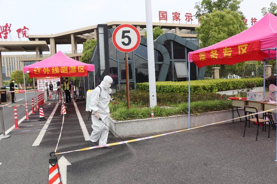 演练主要进行了学生返校复学校园管控与突发事件应急处置、寝室突发事件应急处置三项演示。根据模拟情境,演练自驾车按交警指挥进入预设车辆通道并在指定下车点学生下车,学生按间隔要求有序排队,经过查看健康码、测温后进行闸口人脸识别有序入校;应急处置的场景设置为一名学生因体温测量显示37.9℃,启动应急处置预案,按报告、复测、应急车辆送医、密切接触者排查、活动轨迹消毒等处置流程进行处置;模拟寝室突发事件情境中,发现一例体温异常并伴有头痛的学生,学院立即启动应急处置机制,依次进行了报告处置、隔离测温、120急救车转运定点医院、密切接触者隔离、活动轨迹消毒、后续排查等的规范处置。整个演练过程指挥有力,环节紧凑,应急人员分工明确、反应迅速,总体达到预期效果。