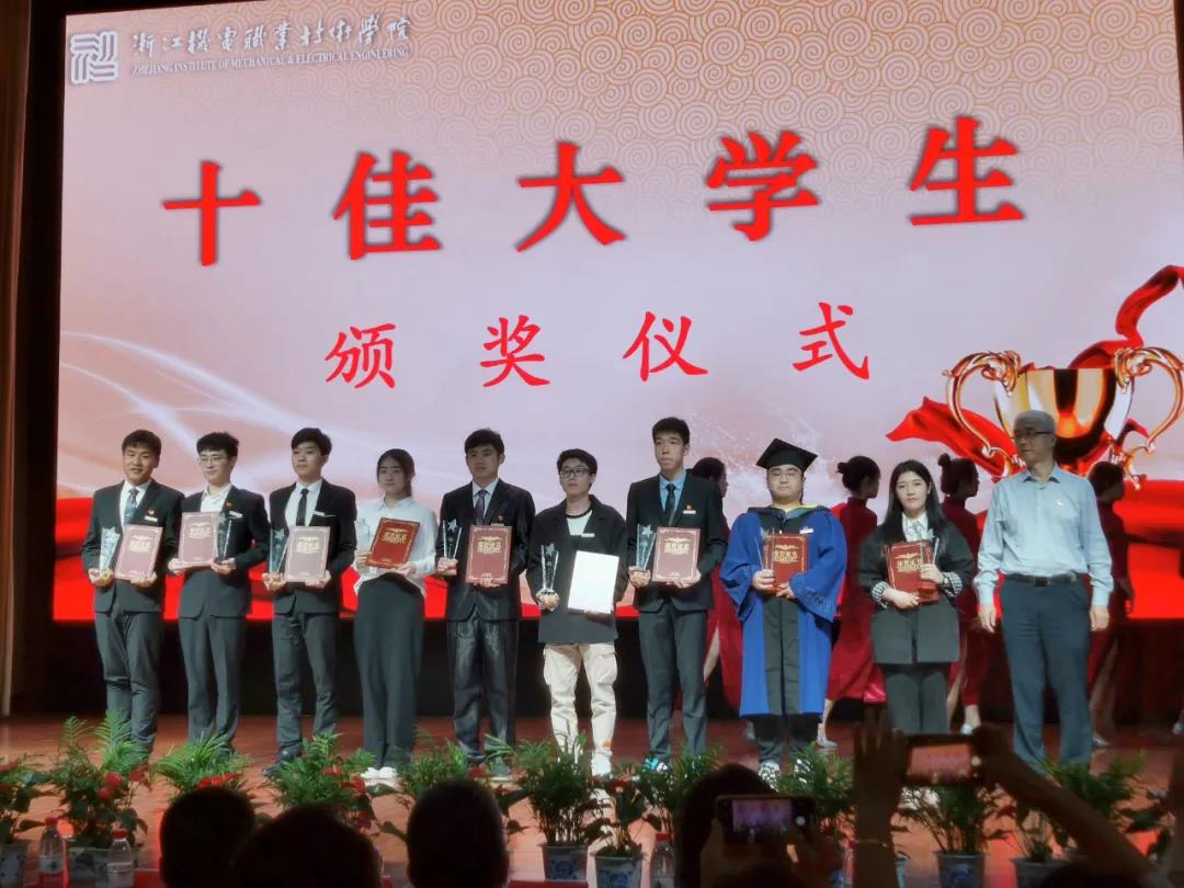 评选活动中20名在思想道德、学业科研、科技创新、非遗传承、社会实践等方面具有非常突出表现的候选人根据抽签顺序进行了限时五分钟的个人方风采展示,展现了他们各自大学期间奋斗成长的“硬核”足迹。他们用实际行动传递着青春能量和榜样的力量,赢得了现场观众一阵赛过一阵的掌声。经过激烈的角逐,电子1802王悦冰、模具1892翁景涛、模具1892苏子超、模具1791吴嘉欣、城电1803王逸钦、城电1802胡琦、材型1802张进、机器人1931余文龙、国贸1883周灵蓉、国贸1932吕婧怡10名同学获2021年浙江机电职业技术学院“十佳大学生”荣誉称号。