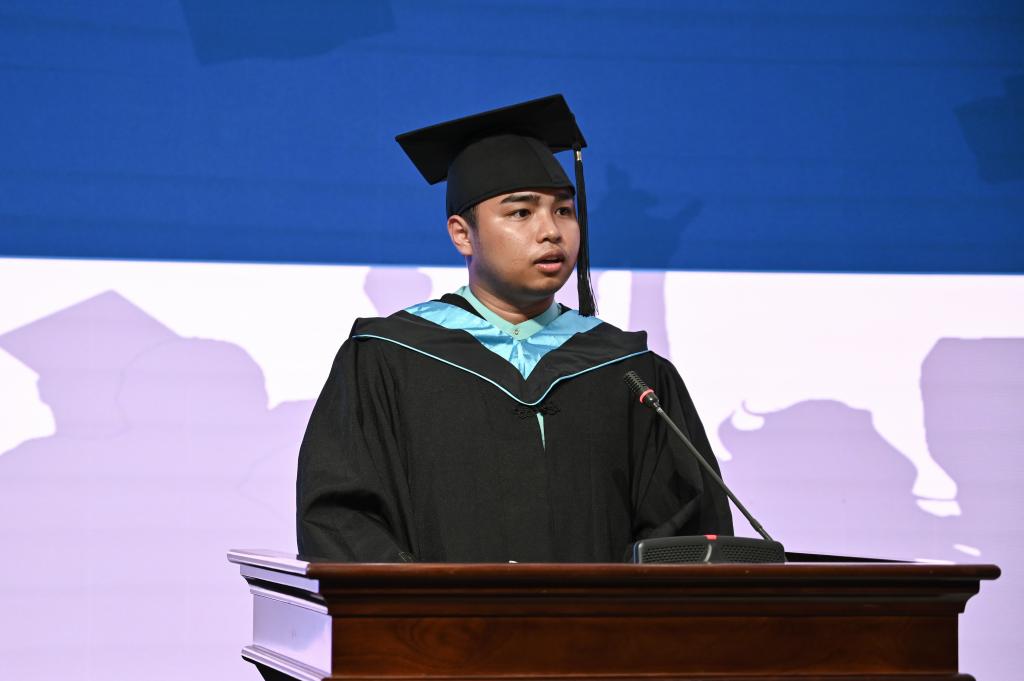 蔡金顺老师作为教师代表发言。他对毕业生顺利完成学业表示热烈的祝贺,对同学们今后的成功表示衷心的祝愿,并向毕业生提出了殷切期望。国贸1883班周灵蓉、物联1881班胡文乐、留学生昂勉恒作为毕业生代表进行发言,他们回顾了自己三年的成长,对学校及所有老师表达了诚挚的感谢,并激励同学们在以后的道路上继续拼搏努力,勇创佳绩,做一个对社会、国家有责任有担当的人。