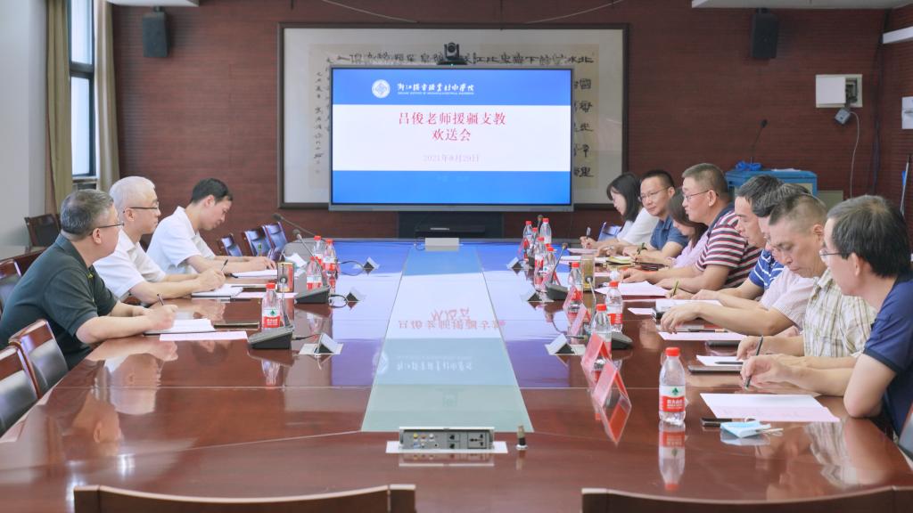 贺校长作总结讲话。他代表学校对吕俊克服家庭困难、积极申报援疆表示感谢,并表示,援疆工作重要意义重大。赴疆后,吕俊老师要注意讲规矩、守纪律,尽快调研熟悉地方产业结构和发展需求,发挥自身特长,从课程建设、竞赛指导、学生稳定、项目申报等方面着手,既重视短期成果、又抓好长期沉淀。最后,贺校长嘱咐吕俊老师在疆期间注意身体,预祝他圆满完成援疆任务,并要求相关二级学院和职能部门当好后盾,为吕俊老师在援疆工作中打响机电品牌提供全方位支持与服务。
