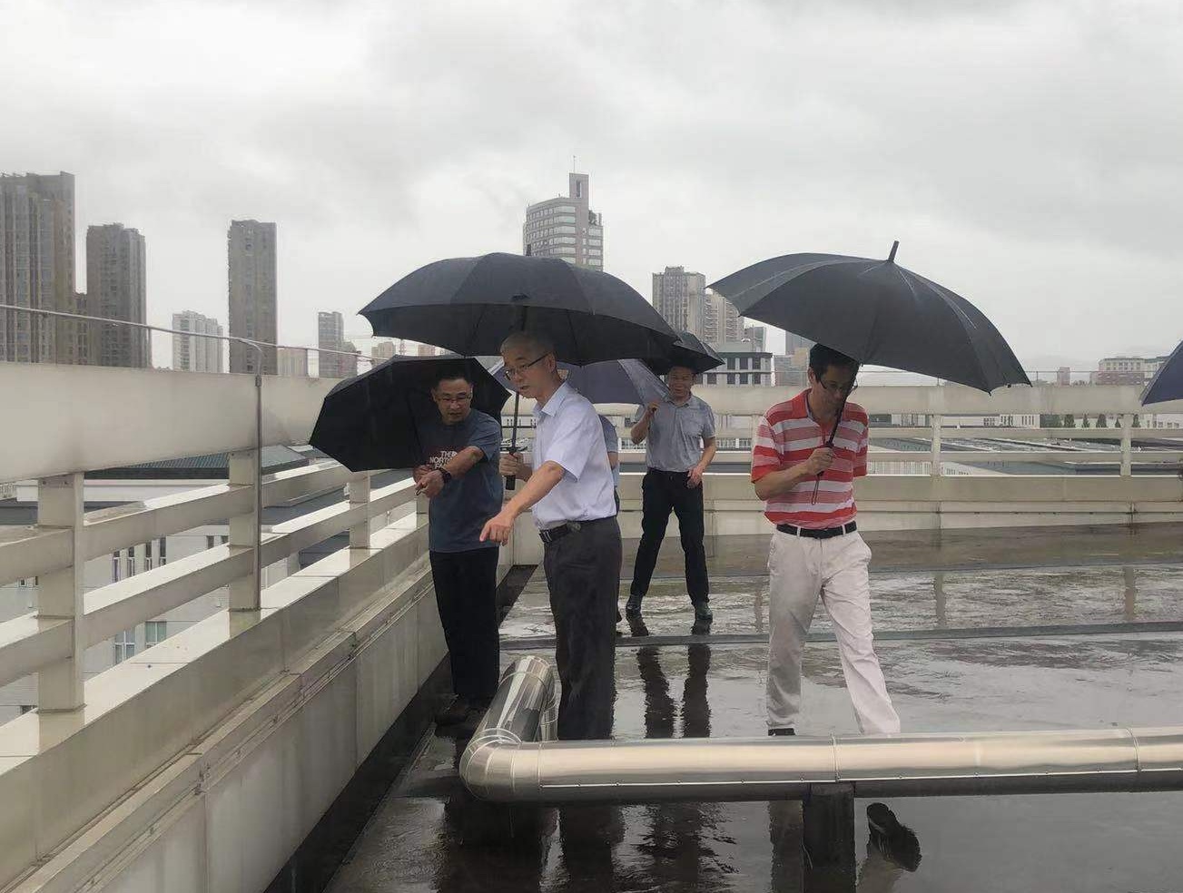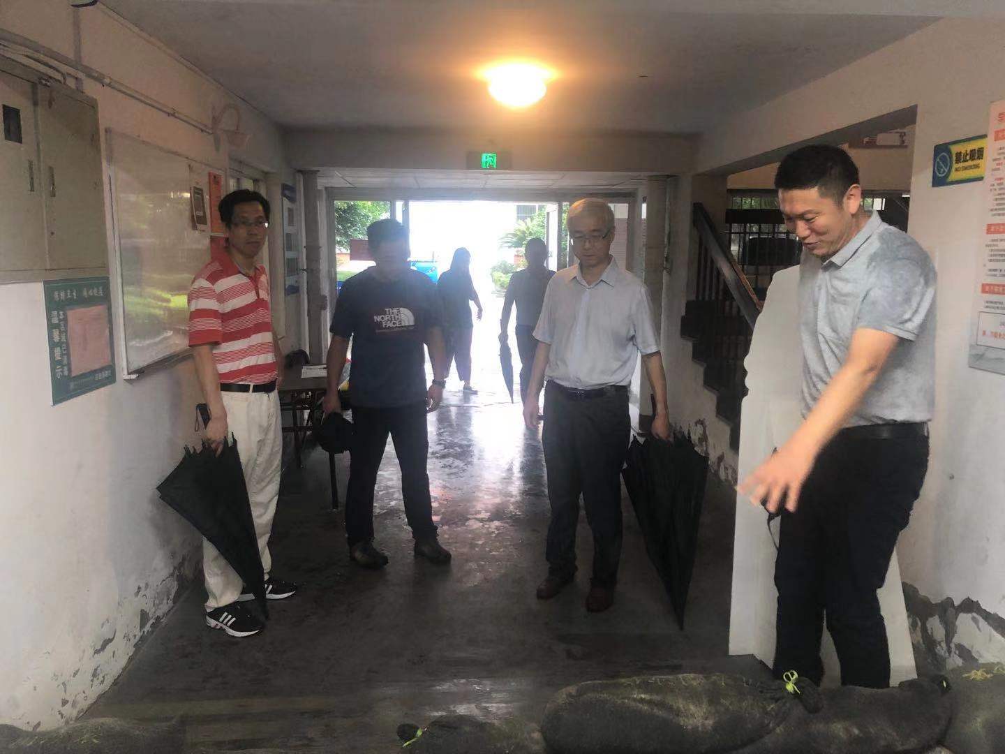 贺校长实地查看了每一幢建筑,仔细查看了校园公共区域、低洼易积水区域井窖的排水准备,体育馆防渗漏准备,五号楼楼顶檐沟清理与排水准备,十号楼学生宿舍架空层防护与应急值班准备,四号楼实训楼实验室积水隔板和排水准备,同时仔细检查与询问了校园树木加固、户外广告撤除等准备情况。