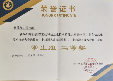 10月13日,由浙江省经济和信息化厅、浙江省人力资源和社会保障厅、浙江省教育厅、浙江省总工会和共青团浙江省主办的浙江省工业和信息化技术技能大赛在杭州科技职业技术学院圆满落幕。智能制造学院数控2003班林陈晓同学、周首臻同学(指导老师:尤光辉、祝洲杰)参加了工业机器人系统运维员(工业机器人技术应用)赛项比赛,获得浙江省二等奖(第三名)1项。同时,我校被评为2021年浙江省工业和信息化技术技能大赛暨全国工业和信息化技术技能大赛选拔赛“团体总分奖”。