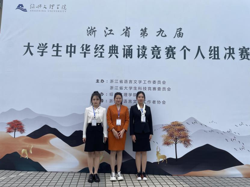 近日,浙江省“第九届大学生中华经典诵读竞赛”决赛在绍兴文理学院落下帷幕。本次大赛由浙江省语委、省教育厅联合主办,来自浙江大学、浙江师范大学、浙江传媒学院等90所高校的234名选手参加本次决赛。我校马克思主义学院吴宪和李小风老师指导的国贸2082陈涵同学获个人组一等奖;吴宪、李小风老师指导的《为了忘却的记念》获得集体组二等奖;董珊珊和程建强老师指导的国贸2081何香妤同学,李小风老师和崔建伟老师指导的营销2032冯秀莹同学分获个人组二等奖;营销2004余奕、国贸1983董莉莎、商数1932章枭杰、城电1912徐瑭等四位同学获个人组三等奖。在此次大赛中,学校共斩获一等奖1项、二等奖共3项;吴宪、李小风两位老师被赛会评为“优秀指导教师”,所获奖项级别和获奖人数在全省高职院校名列前茅。