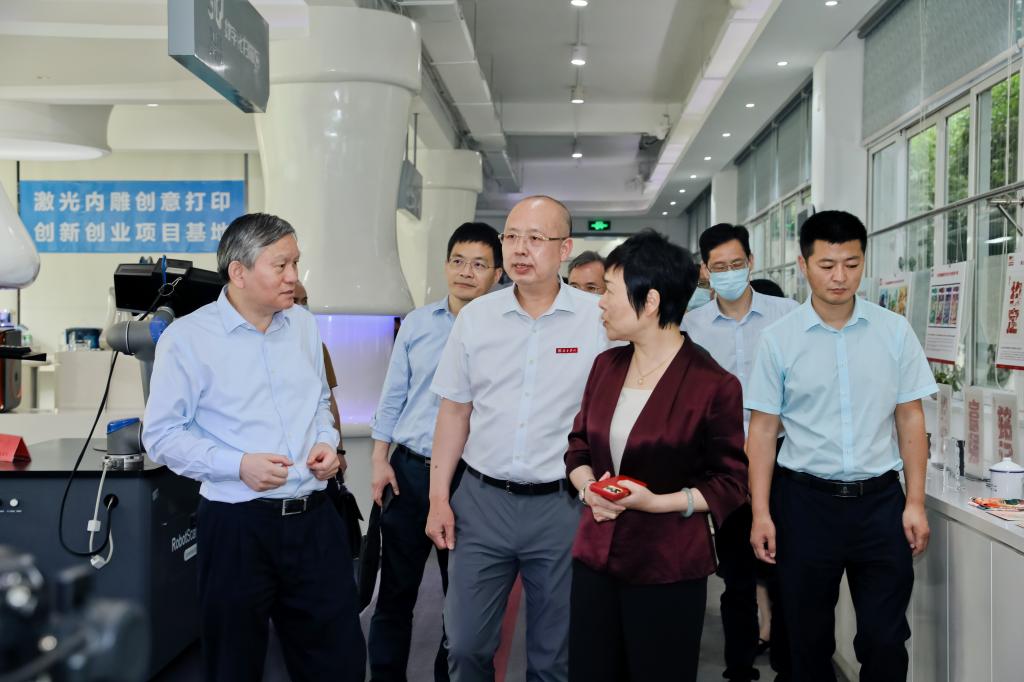 在众创空间,成岳冲一行在3D个性化定制区、数字化教学区等处考察。作为学生自主学习和创作的重要场所,学生作品获得互联网+大赛相关发明专利1项,软件著作权2项,并在浙江省国际“互联网+”大学生创新创业大赛等多个赛事中荣获金奖、一等奖、特等奖等佳绩。成岳冲饶有兴趣地观看学生作品,并与现场正在创作的学生进行了亲切交流,鼓励他们要脚踏实地学好学精技能,争当创新创业先锋。