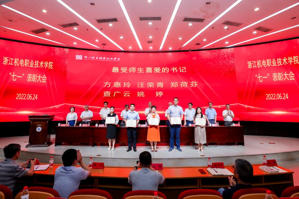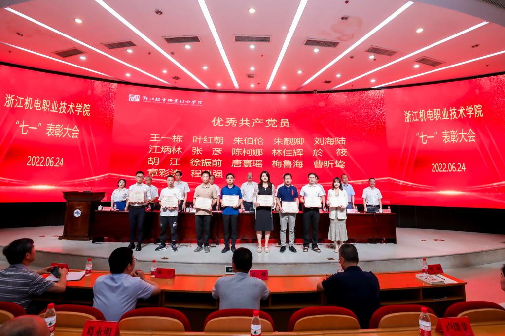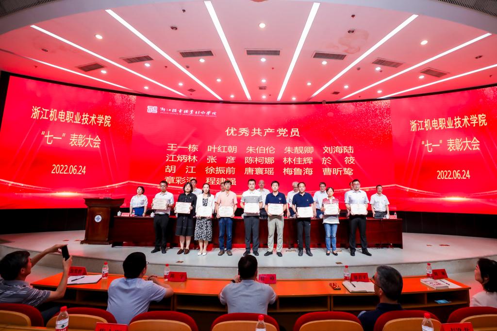 6月24日上午,浙江机电职业技术学院召开“七一”表彰大会,重温党的光辉历程,讴歌党的丰功伟绩,传承党的优良传统,动员和激励全校广大党员干部不忘初心、牢记使命、加压奋进、再立新功,为建设特色鲜明、国内一流、国际知名的高水平职业技术大学而努力奋斗。党委书记汤兆武、校长贺星岳,校领导班子成员周增逵、王建林、周纯江、丁明军、王斌、项建斌、邓劲莲等出席会议,全体中层干部、党支部书记、学生党员代表参加会议。