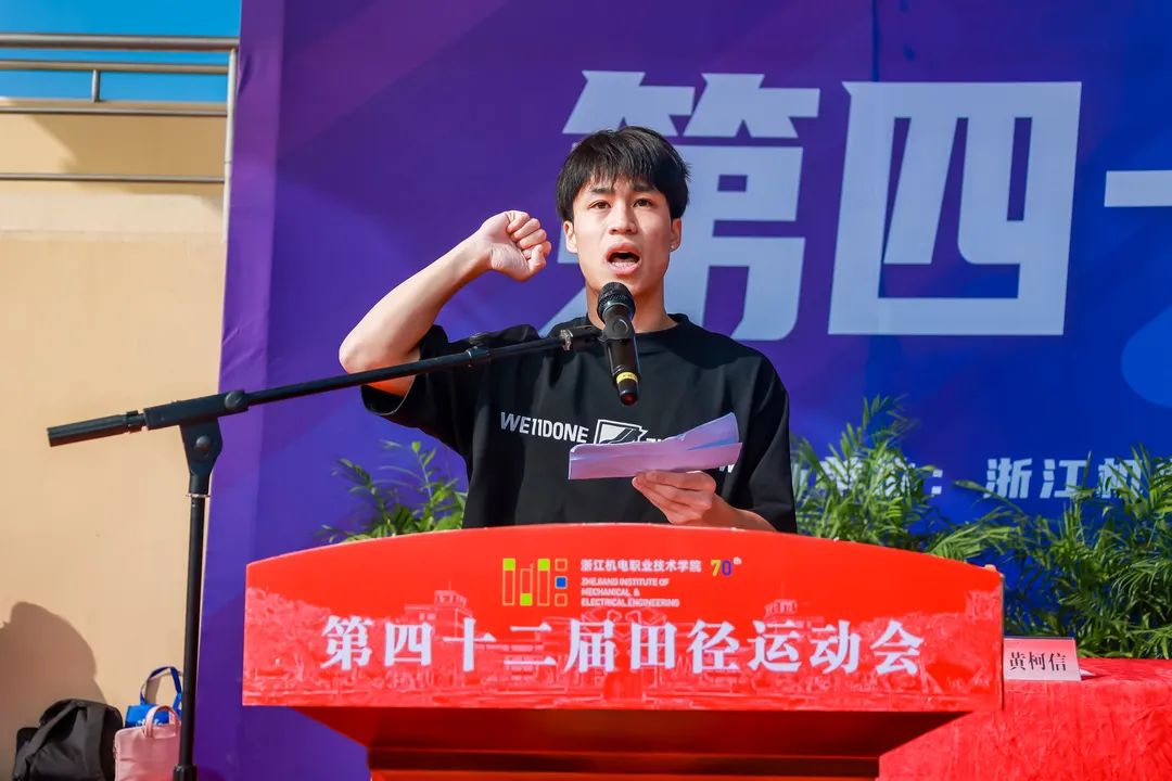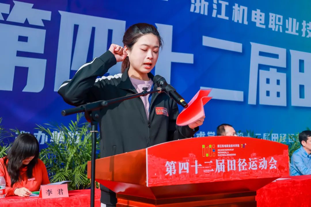 开幕式上,公共基础教学部、体育部陆清逸老师作为裁判员代表宣誓。2022年浙江省大学生田径锦标赛冠军、自动化学院机电2141班杨鑫同学作为运动员代表宣誓。
