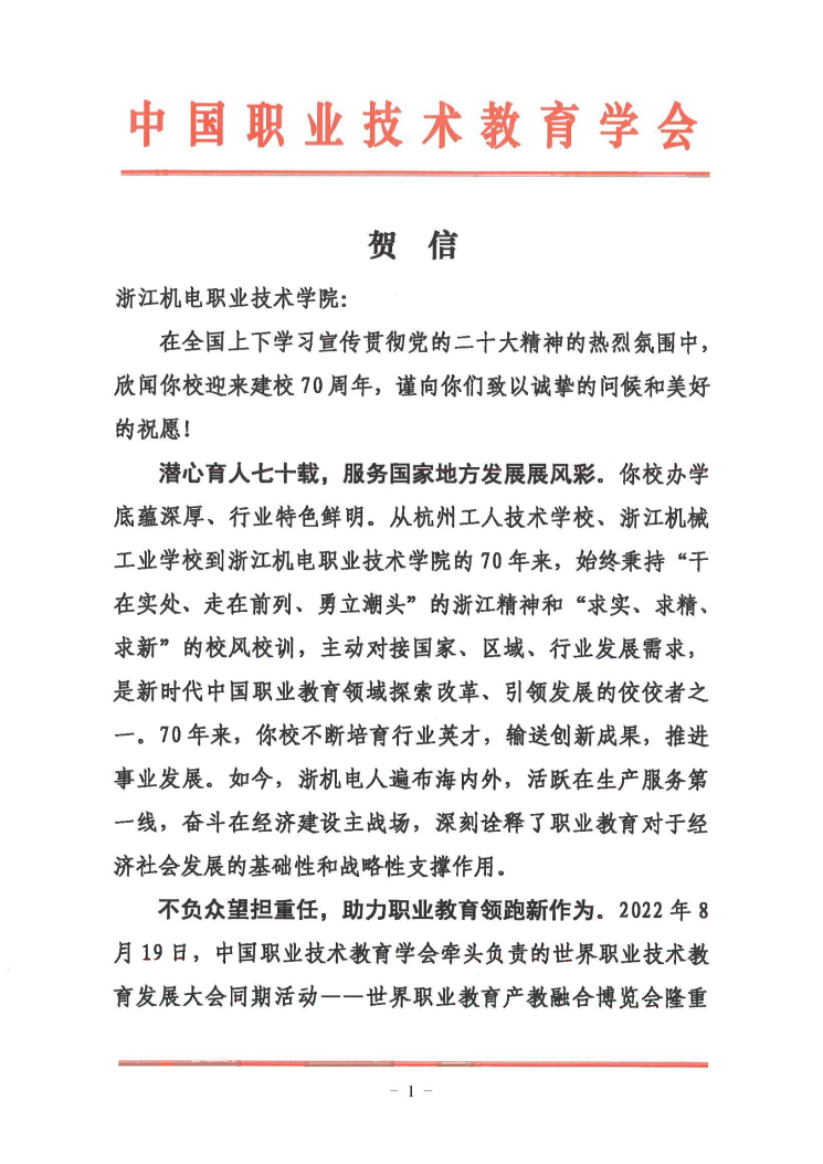 教育部原副部长、中国职业技术教育学会会长鲁昕专门发来贺信,殷切寄语学校切实发挥基础性、战略性支撑作用,推动高质量发展,在助力共同富裕、增强文化自信、服务乡村振兴、支撑实体经济、推进协同创新等方面勇担新使命、作出新贡献。中国科学院院士叶志镇专门发来贺信,希望学校立足专业优势,依托产业布局,服务国家战略和区域经济转型升级。学校还收到了中国机械职业教育发展中心、滨江区政府等部门,兄弟院校、社会各界发来的贺信、贺电百余封。
