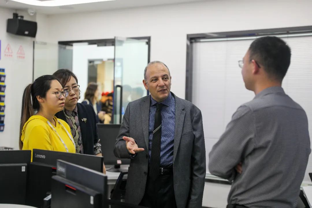 Dr. Elsabbagh一行参观了学校工业机器人焊接技术应用中心、轨道交通智慧运维实训基地、智能制造技术实训基地、智能控制技术实训基地、3D打印应用技术示范基地等。他时不时驻足询问,和在场师生交流,观摩实训作品。他对同学们娴熟的实践技能表示肯定,对老师的悉心、有特色的课程指导表示赞赏,对学校数字化建设成果、先进的智能制造技术实训配置,师资配备和人才培养等连连点赞。