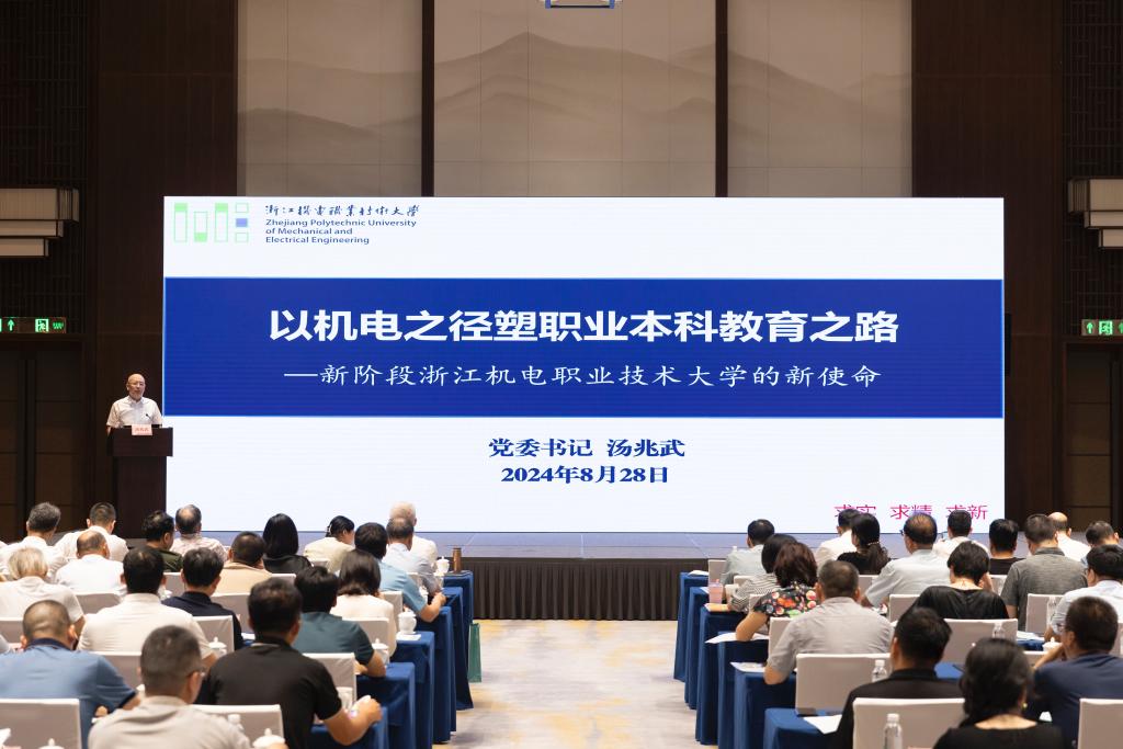 汤兆武作题为《以机电之径塑职业本科教育之路——新阶段浙江机电职业技术大学的新使命》的主题报告。他指出,学校要始终牢记总书记嘱托,勇立潮头,奋楫争先,以浙江机电职业本科教育之径,探索职业本科教育之路;以满腔热情和坚定信念,共同开创一条具有中国特色、浙江范式的职业本科教育发展之路,为国家繁荣与民族复兴贡献智慧与力量。