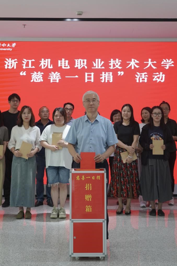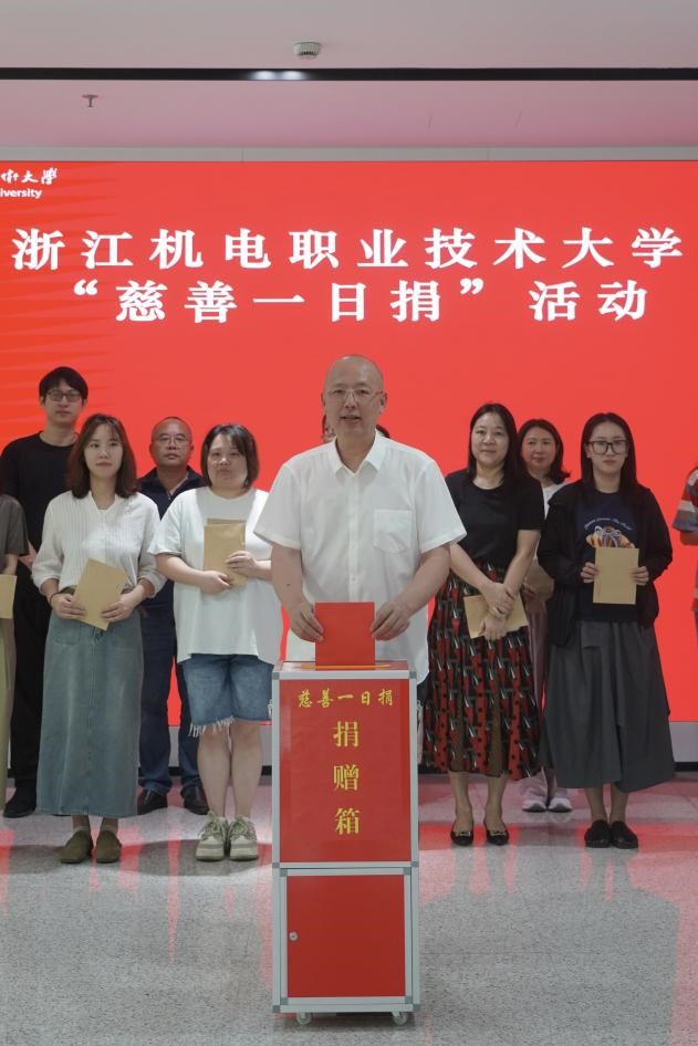 《中共中央关于进一步全面深化改革、推进中国式现代化的决定》提出,“在发展中保障和改善民生是中国式现代化的重大任务”。为深入贯彻党的二十届三中全会关于支持发展公益慈善事业要求,传承弘扬慈善文化,支持推动慈善事业发展,营造“人人行善、行善光荣”的浓厚氛围,助力高质量发展建设共同富裕示范区,根据浙江省民政厅和浙江省机电集团有限公司党委关于开展“慈善一日捐”活动部署,学校党委于9月30日下午组织开展2024年“慈善一日捐”活动。校党委书记汤兆武、校长贺星岳等党委领导班子成员带头捐款,依次将爱心善款投进捐款箱。部分校领导因工作原因不在现场,均通过线上捐款等方式参与活动。