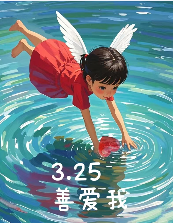 带翅膀的小女孩努力捞取水中爱心,那爱心就是我们对自己的善意与关爱。水如同潜意识的海洋,隐藏着内心深处的情感。小女孩专注的模样,代表着我们要勇于深入内心,在情绪的波澜中,主动去探索、发现、拥抱对自己的善与爱,珍视自我,呵护内心的温暖与美好。——计算2402 刘若晴