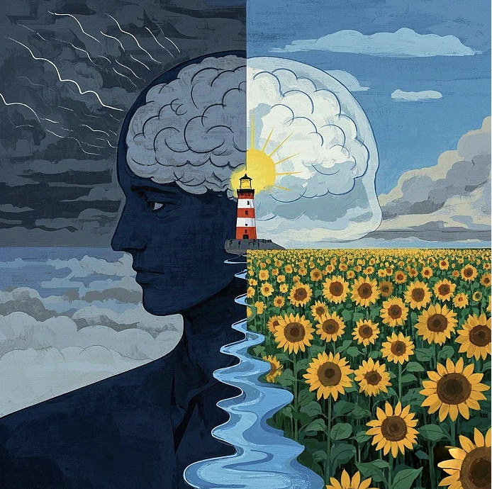 作品展现心灵的双重面貌——左侧阴云密布,象征痛苦;右侧阳光普照,寓意希望。中央灯塔象征内在觉知之光,指引自我善待之路。蜿蜒河流连接黑暗与光明,寓意情绪流动的可能性。即便身处黑暗,也要相信内心仍存光明,温柔关照自己,才能走向心灵的晴朗之境。——计算2461 应柯胜