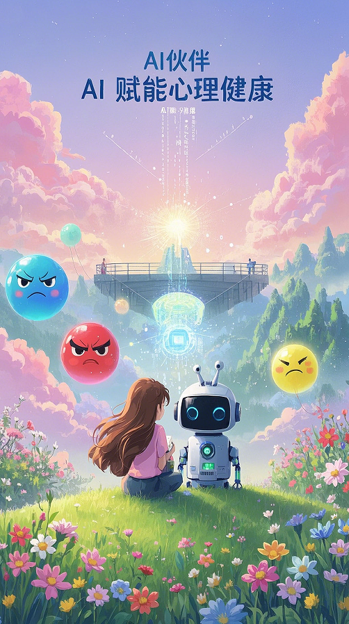 本作品以宫崎骏温暖画风为基调,描绘AI与人类心灵的共生关系。少女与数据流幻化的伙伴置身花海,象征AI技术对情绪的疗愈与赋能;齿轮化为桥梁连接现实与内心世界,传递“科技温暖心灵”理念。灵感源自《龙猫》的治愈感与《哈尔》的机械浪漫,结合即梦app生成主体画面,诠释科技与情感交融的积极未来。——网络2302 朱晨茜