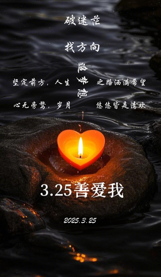 这是一张“3.25善爱我”主题的心理海报。暗沉背景中的水波,象征着生活中令人迷茫的困境。爱心蜡烛于石块上燃烧,代表内心的希望与力量。“破迷茫 找方向”等文字,激励人们直面内心困惑,坚定前行。用的AI工具是豆包,将自己的想法输入然后生成图片,文字部分是自己输入的。意在提醒大家学会自我关爱,守护心理健康。——网络2402 张亦清