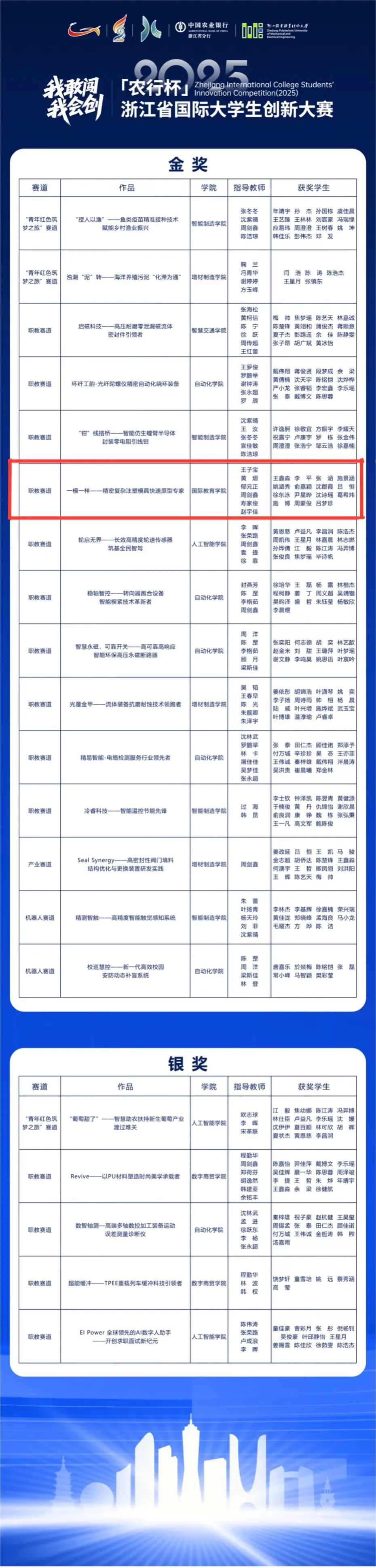 近日,备受瞩目的“农行杯”浙江省国际大学生创新大赛(2025)在浙江机电职业技术大学完美落幕。浙江机电职业技术大学国际教育学院的“一模一样——精密复杂注塑模具快速原型专家”项目凭借突破性的技术创新与清晰的产业化路径,从众多优秀项目中脱颖而出,斩获大赛金奖,创造了我院在该项赛事中的历史最好成绩,同时也为我国精密制造领域的技术革新再添亮眼成果。
