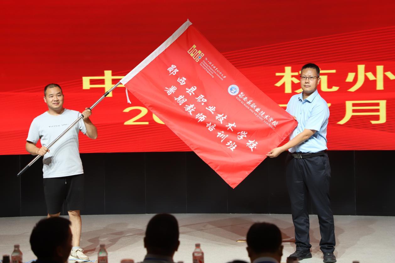 随后,王瑞权向培训班学员代表王祝授班旗,标志着郧西县职业技术学校暑期教师培训班正式成立。