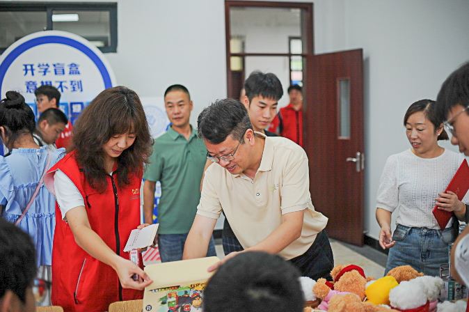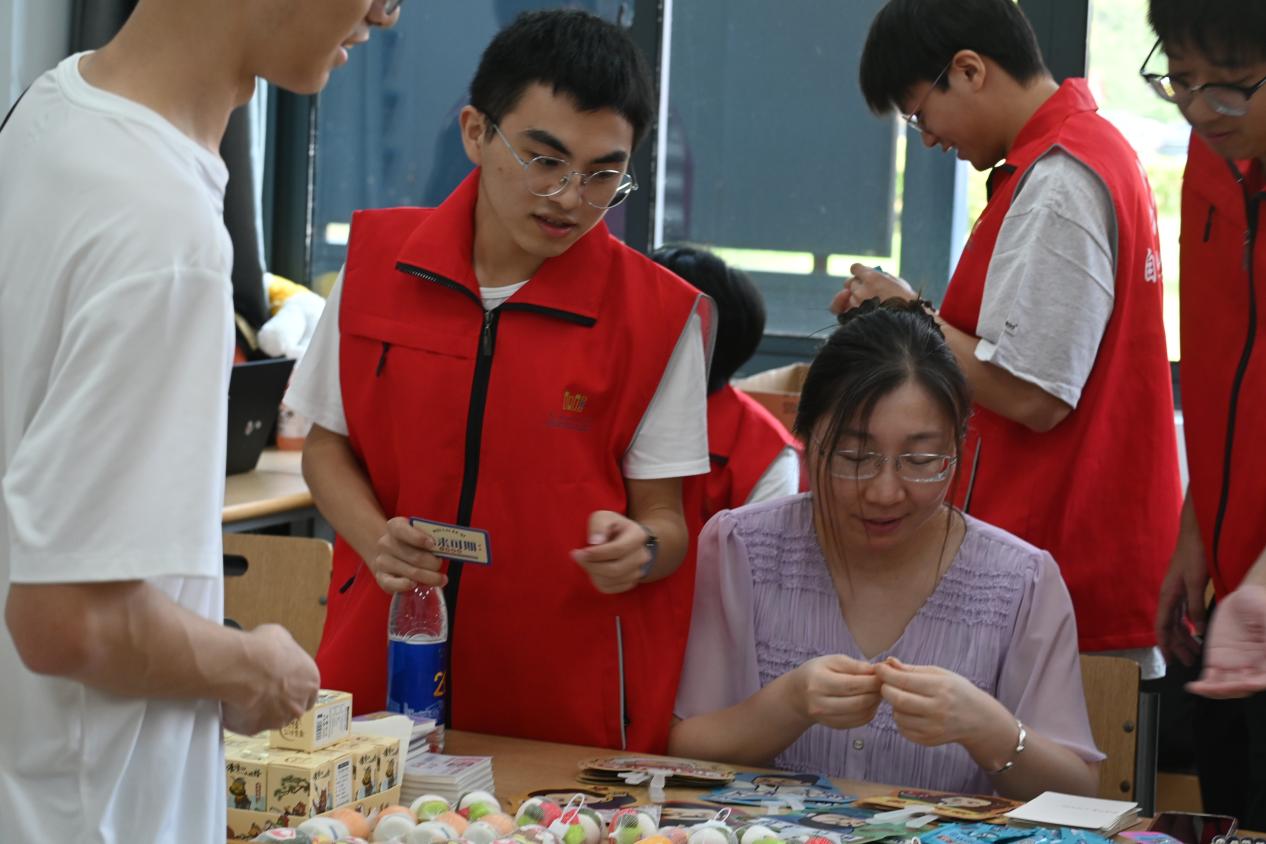 现场最引人注目的,莫过于学院为新生精心筹备的“浪浪山小妖怪” 主题盲盒墙 :五颜六色的盲盒沿着墙面整齐陈列,里面装着学院专属的定制好礼——既有印刻学院标识的钥匙扣,也有印着萌趣图案的笔记本,更有学长学姐亲笔书写的暖心祝福。新生们围在盲盒墙前,带着好奇与期待挑选属于自己的盲盒,拆开瞬间的惊喜与笑容,为迎新现场增添了无数温暖瞬间。