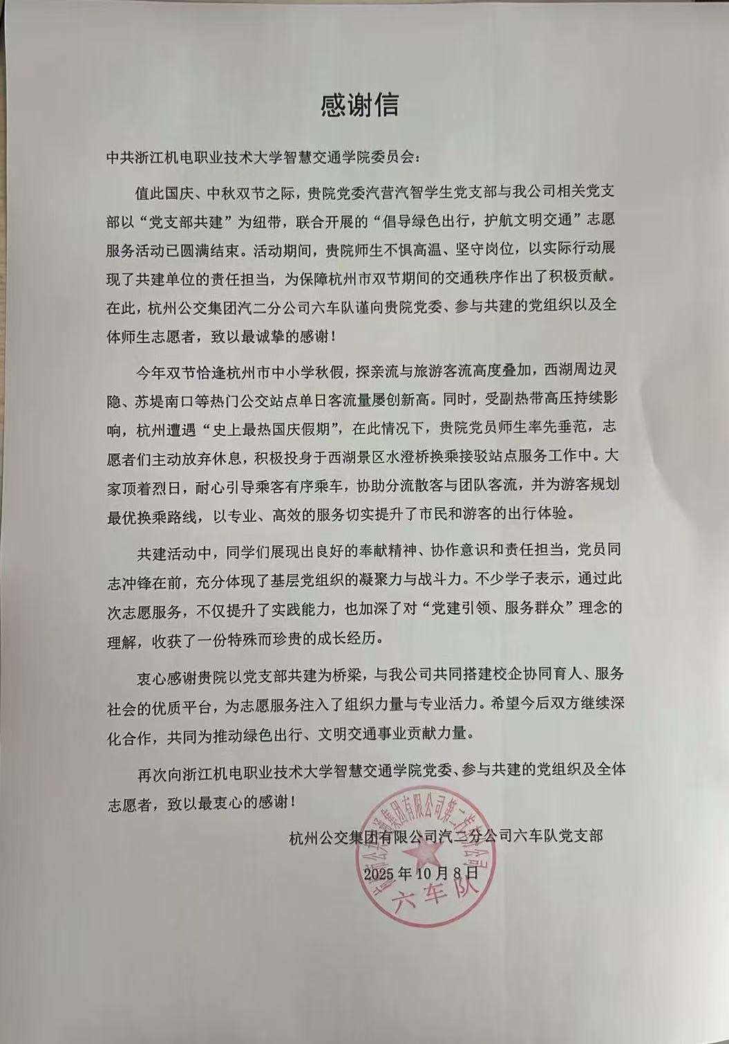 他们在这个假期放弃了休息时间,以热情周到的服务,赢得了市民和公交集团的一致好评。杭州公交集团有限公司汽二分公司六车队党支部特别向智慧交通学院党委及参与志愿服务的学子发来感谢信,对他们的辛勤付出表示充分肯定。