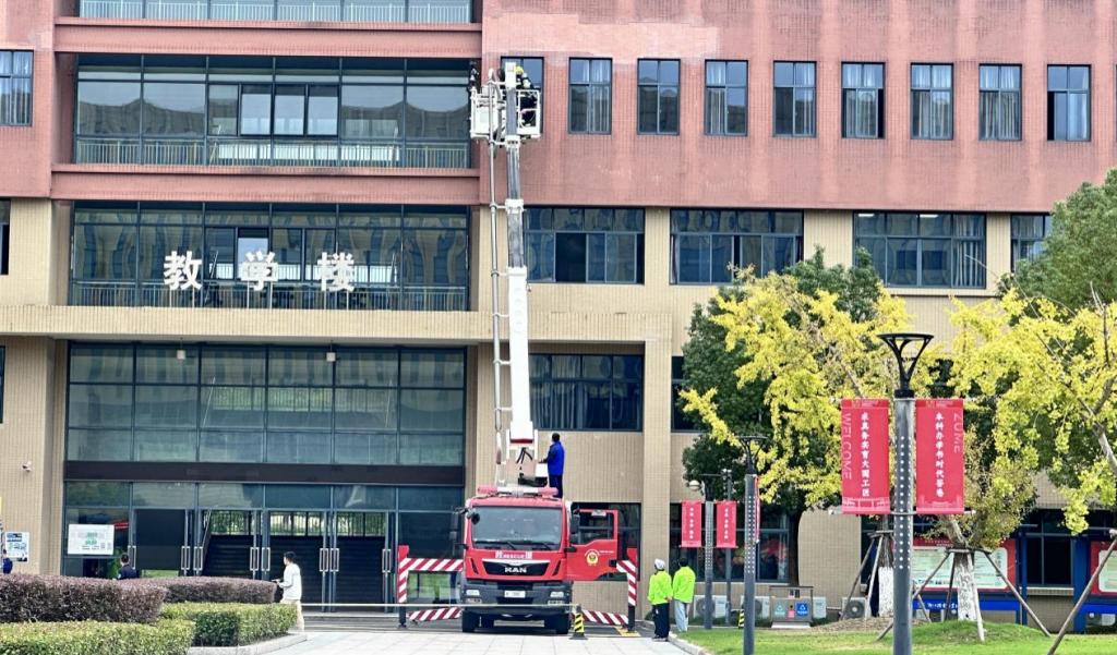 中午12点30分,活动正式拉开帷幕。在烟气和警报声中,师生们迅速响应,在志愿者疏散引导下,以“捂鼻弯腰、小步快跑”姿势沿疏散通道撤离,3分钟内全部抵达指定区域。与此同时,长安镇消防站消防员、校医疗救援人员、微型消防站消防员反应迅速、配合默契,以训练有素的专业操作,高效完成灭火救援与人员疏散全流程演练,整个过程紧张有序、衔接顺畅。针对被困于教学楼4楼的“受困者”,长安镇消防站消防员操作云梯车实施高空救援,让师生直观感受专业救援流程。