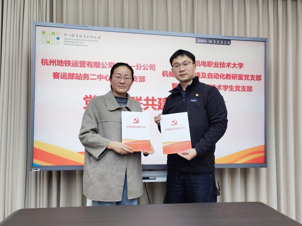会上,副站区长徐家豪、客服管理工程师朱彦恢、智能建维部经理李超越与学院机械设计制造及自动化教研室党支部书记杨天玲及智能制造工程技术学生党支部书记孙佳晨进行了业务交流,在党建互联共建项目开展工作方面达成了共识。杭州地铁运营有限公司客运一分公司客运部站务二中心第三党支部分别与机械设计制造及自动化教研室党支部、制造工程技术学生党支部签订了党建共建协议。
