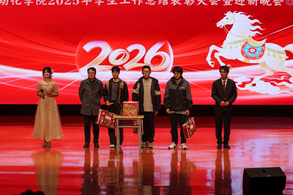 在热烈的文艺展演间隙,晚会还设置了惊喜抽奖互动环节。学院领导为幸运同学送上奖品和新年祝福。现场气氛瞬间升温,欢呼声与掌声此起彼伏,生动展现了自动化学院融洽和谐、亦师亦友的育人氛围。