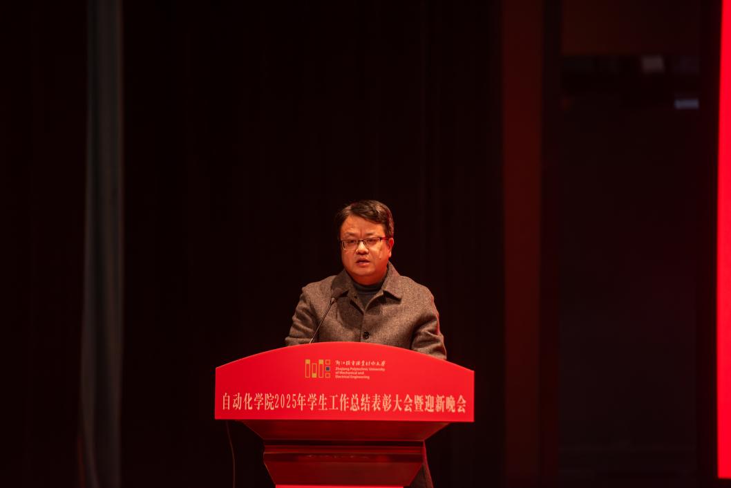 12月24日晚,自动化学院在海宁校区小剧场隆重举行“弄潮砺匠,岁启华章”2025年学生工作总结表彰大会暨迎新晚会。学院党委书记刘哲纬,党委副书记方惠玲,副院长吕俊及各办主管出席大会。全体辅导员、教师代表与各年级学生代表共同参会。大会由学工办主管沈丹主持。师生齐聚一堂,共同回顾过去一年的奋斗历程。