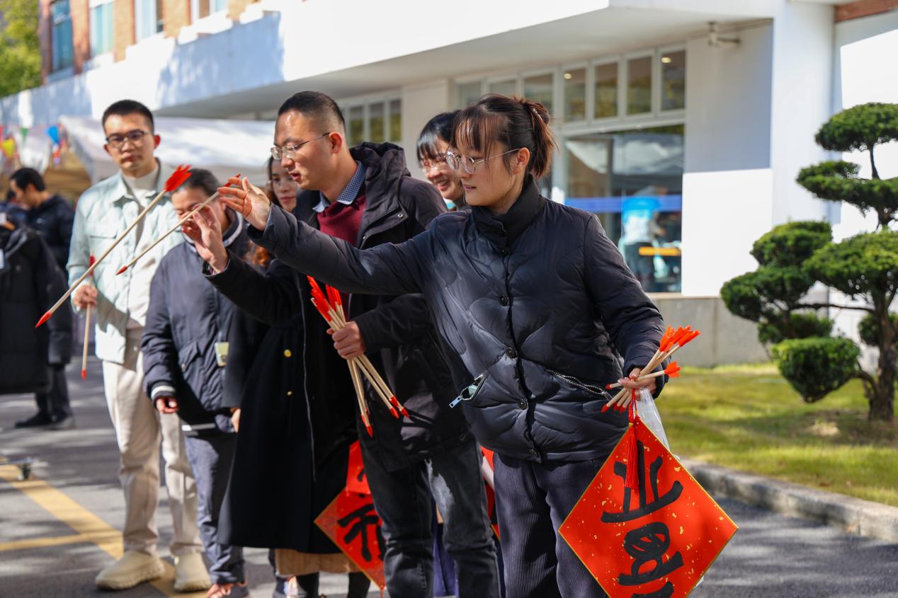 除了丰盛的物资采购,年货节现场还化身为欢乐的海洋。主办方特别设置了“福气夹马”“新春投壶”“蒙眼敲锣”等趣味互动游戏。教职工们在选购年货之余,纷纷驻足参与,现场挑战手速与技巧,在欢声笑语中找回儿时的快乐,赢取“福马”萌趣玩偶、喜庆对联套装、吉祥福字贴等精美新春礼品。游园活动不仅增添了节日的趣味性,也为教职工们提供了轻松愉快的交流平台。