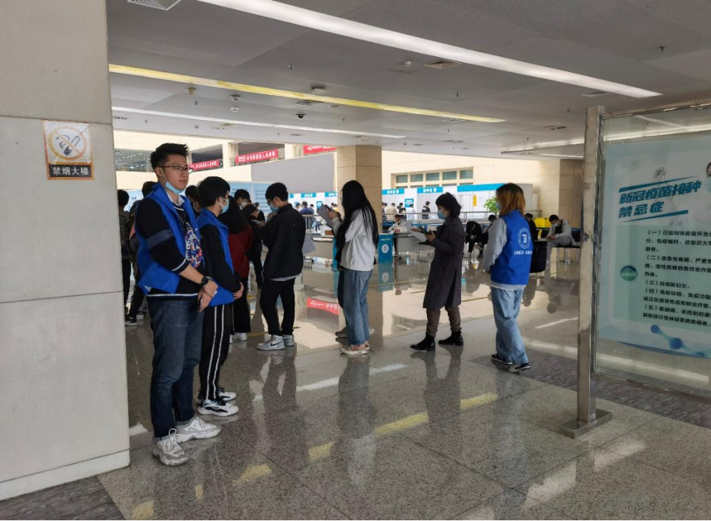 现代信息技术学院团总支组建了志愿服务小队,应用小程序扫码进行接种信息采集。接种现场,志愿者除了负责现场引导、信息采集、电脑登记、疫苗接种外,还配合方舱安全保障人员,随时保障接种安全。