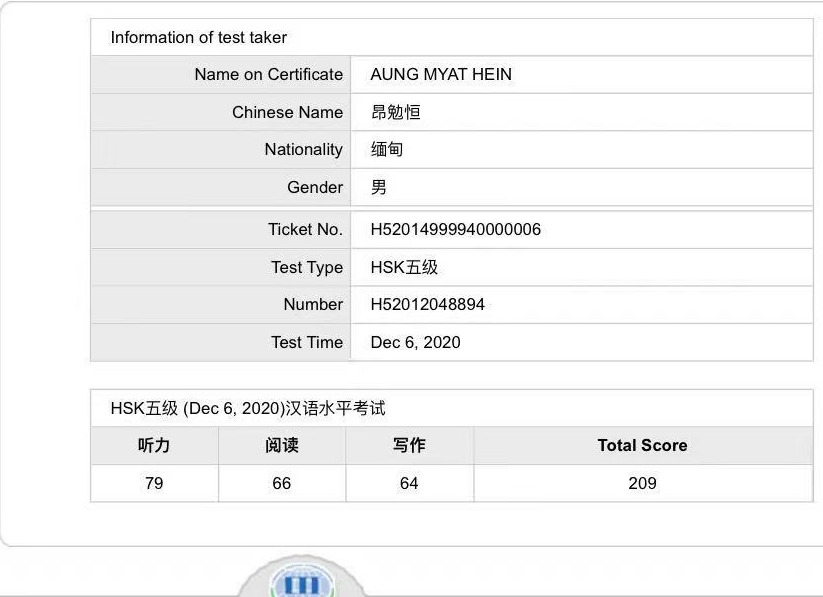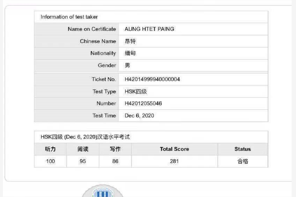 日前我校缅甸留学生肯纽、昂勉恒、昂特三位同学在2020年12月6日的考试中又一次全部通过HSK四级和五级!其中昂特同学的听力得了满分,获得了281的高分,肯纽同学获得了240分的高分。