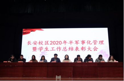 12月25日晚,长安校区2020年度半军事化管理暨学生工作总结表彰大会在长安小剧场举行。学工部部长张伟、学工部副部长王汇、团委方烨炜、长安校区全体辅导员以及各班班干部代表参加了本次会议,会议由学工部副部长方惠玲主持。