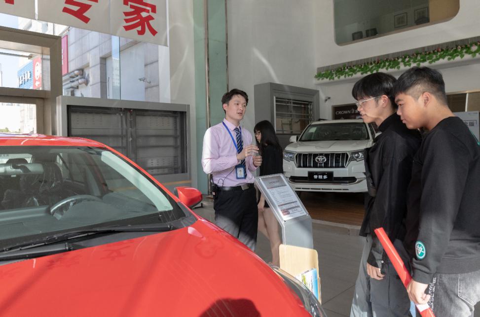 滨文丰田店的工作人员热情的接待了我们。首先,同在滨文丰田店实习的学长袁佳晖给我们介绍了丰田热销的各系车型,如销量王卡罗拉、亚洲龙、普拉多等,学长对各款车型和行情如数家珍,学长的职业素养让学弟学妹着实开了眼界。
