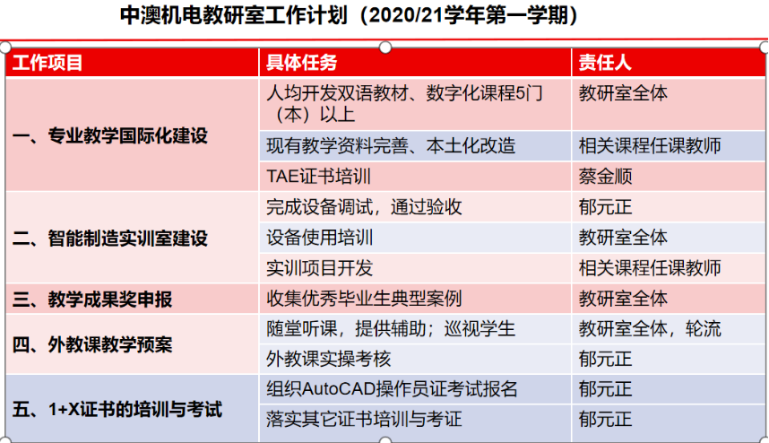 最后,六个教研室主任(专业带头人)分别针对本学期的工作要求、目标任务,做了专题汇报。细化工作,责任到人。