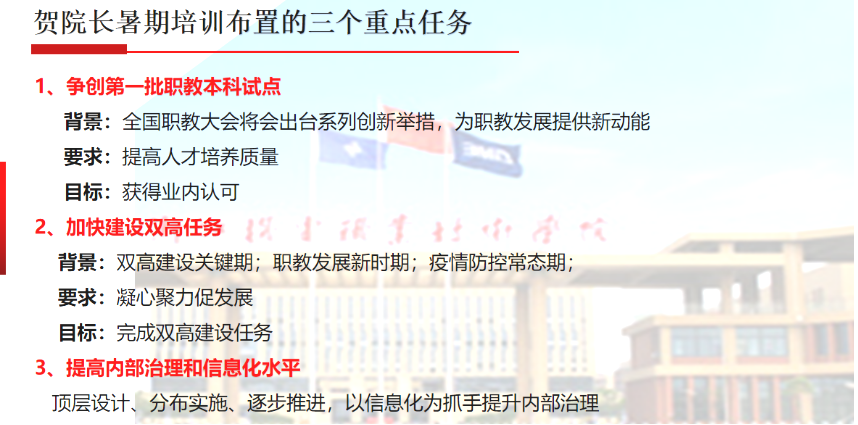 新学期,新目标,新挑战!国际教育学院将以此次分院教职工大会为契机,紧跟学校发展步伐,讲形势、抓学习,落实学校“双高”建设、争创第一批职教本科试点目标要求,以更高的站位、更严的标准、更实的举措全面落实好各项工作,以新面貌、新担当、新作为迎接更大的挑战。