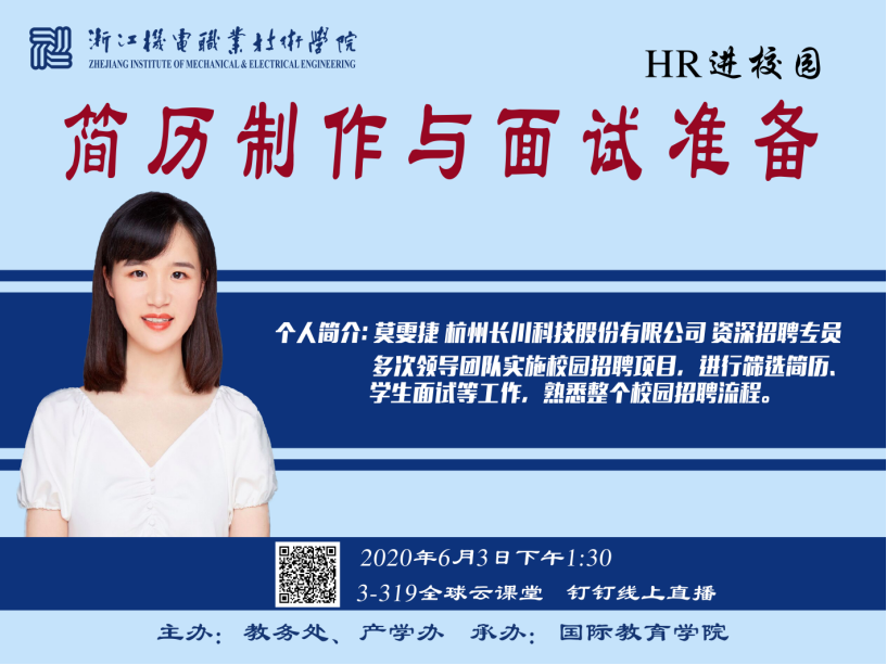 “HR眼中的人才是怎样的?”“求职简历怎么制作?”“什么样的求职者HR无法拒绝?”这是学生工学结合、毕业求职普遍关注的问题。6月3日下午,国际教育学院在滨江校区3-319全球云课堂举办“HR进校园”——《简历制作与面试准备》讲座。此次讲座邀请了杭州长川科技股份有限公司资深HR专员莫雯捷,国际教育学院252名18级学生通过线下、线上方式参加了此次讲座。