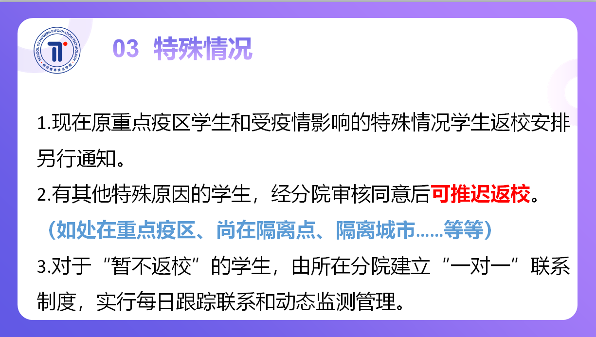 为了保障师生健康和安全,扎实做好学院复学返校和疫情防控工作,现代信息技术学院于4月27日晚上7点召开了学院全体班主任企业微信视频会议,学院党总支书记任峰主持会议,并对复学返校的疫情防控工作进行了详细部署,对两校区学生返校告知书进行了讲解。