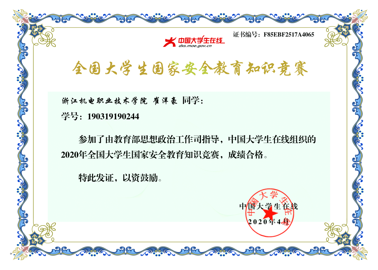 课程结束后,同学们在中国大学生在线完成了国家安全知识在线答题,并获得了证书。