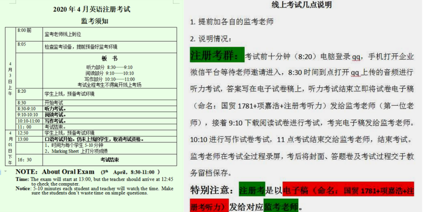 虽然监考教师和同学只在“云端”相见,但监考工作流程依然按照规范进行,核验考生身份、宣读考场规则、要求考生将设备摄像头打开对准答题画面、监考教师全程在视频中巡视同学答题情况。澳方《英语注册考》完全按照线下,考试流程标准化,开考40分后交听力试卷,100分钟后交阅读理试卷、考试结束后交写作试卷。一名学生群里留言:“原以为要五月才能回校参加补考,毕业前,课程补考在一直是个心结,幸好学校提前组织补考,这样的补考方式全程也很顺畅,感谢老师们辛苦安排。”