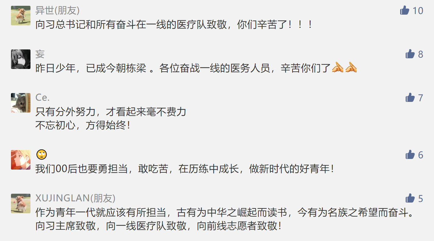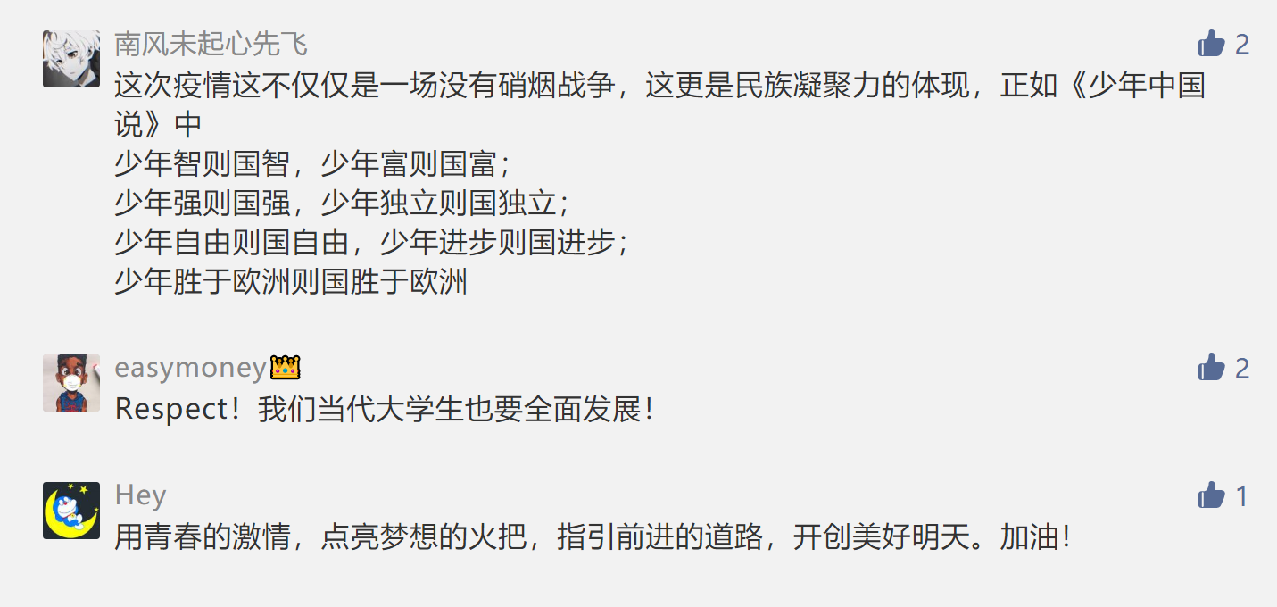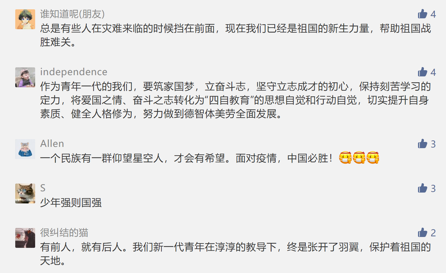 读了习总书记的信,我深有感触。同为“90后”的我,虽不能像他们一样,直面病毒,治病救人,但我会服从学校安排,不外出,在家中上好每一次网课,认真学习知识。相信在不久的将来,疫情终将过去,我们“90后”必会接好时代的接力棒,在社会各个领域中发光发热。