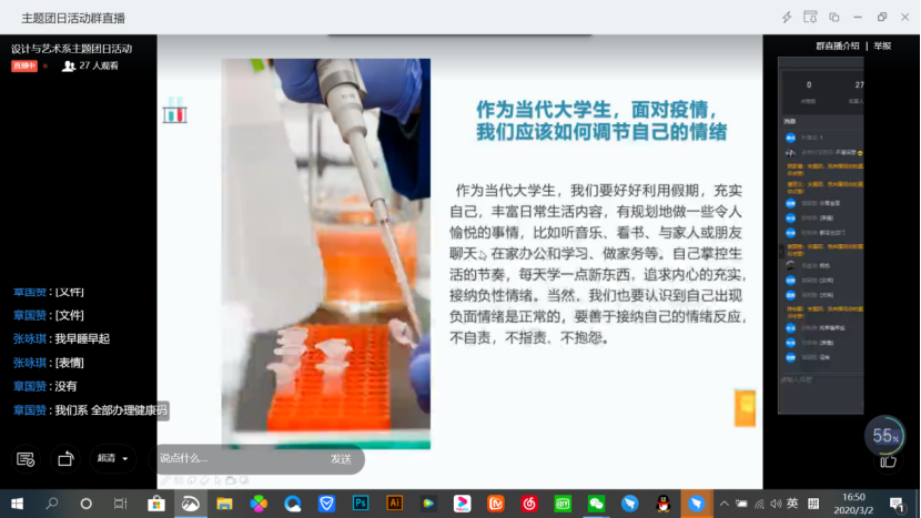 3月2日设计与艺术系团总支书记章国赞、团总支副书记宋昊阳与各班团支部通过钉钉视频会议、ppt展示,科普什么叫新型冠状病毒及预防措施等进行线上活动。提高大家的防疫意识,增长防疫知识,同时也了解了有关疫情的发展状况。提倡每个人从自身做起,为身边的亲朋好友做出榜样。同时,引导团支部成员承诺践诺,影响带动身边人群严格遵守关于疫情防控的各项规定。听从学校安排,保持联络通畅,不提前返校;少出门、不扎堆、戴口罩、勤洗手,做好返校前的每日健康打卡。会后各团支部以本次线上活动为主题,在本班级内通过企业微信、钉钉等工具进行班级线上宣讲,引导设计学子及时了解防疫知识、提高大家的防疫意识,及疫情的发展状况。同时也了解在此次疫情防控工作中涌现出的先进事迹,营造向先进学习致敬的浓郁氛围,弘扬社会主义核心价值观。明确了要深刻认识做好防疫工作的重要性和紧迫性,牢固树立“疫情就是命令,防控就是责任”的思想,积极配合相关工作。本次活动圆满展开,并取得了实效。