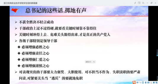 随后,全体学生骨干一起学习习近平总书记在统筹推进新冠肺炎疫情防控和经济社会发展工作部署会议上发表的重要讲话精神。习总书记的讲话让大家树立了战胜疫情的强大勇气和信心,并深刻感受到这场危机面前中国的大国风范和党的领导能力。同学们纷纷表示,一定要认真领会和贯彻总书记讲话精神,为疫情防控、保持经济社会良好发展、早日打赢这场疫情防控攻坚战贡献青年力量。