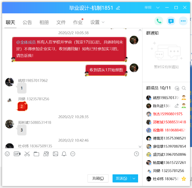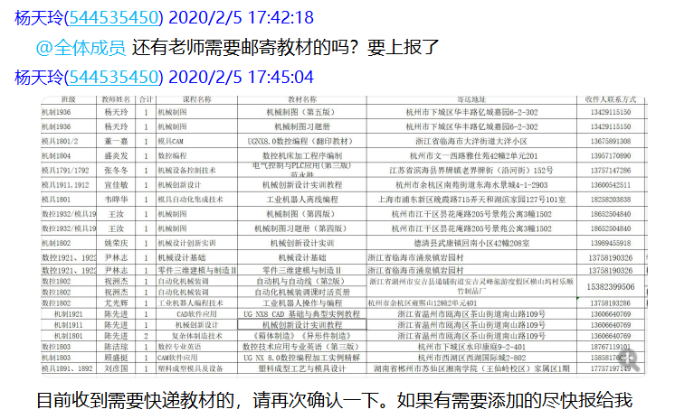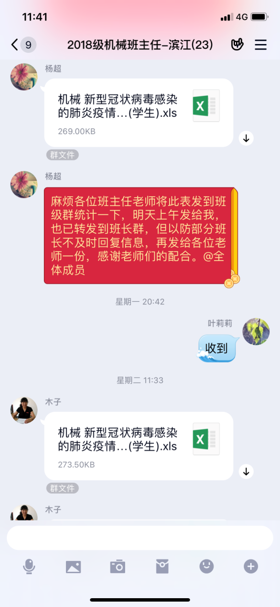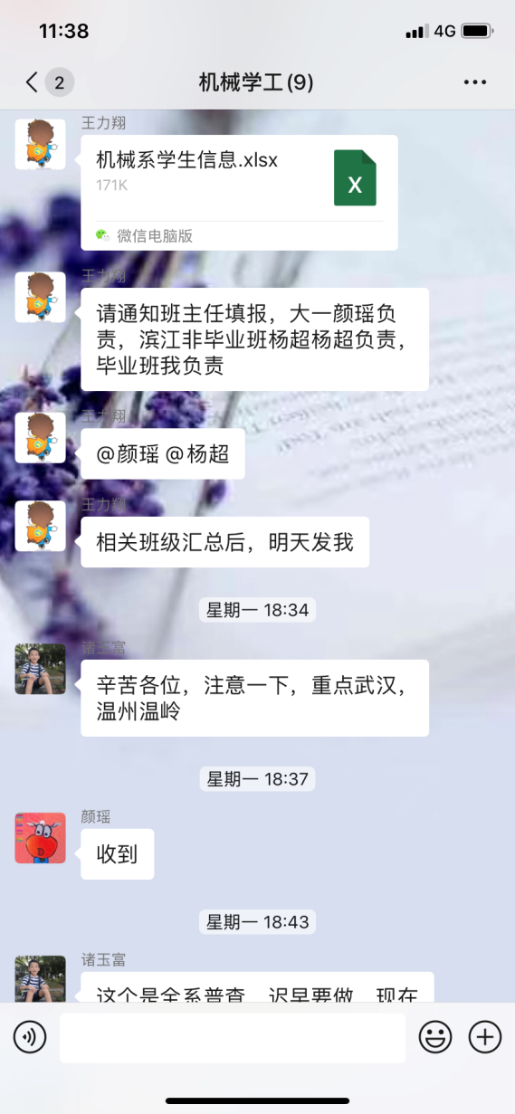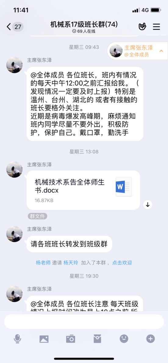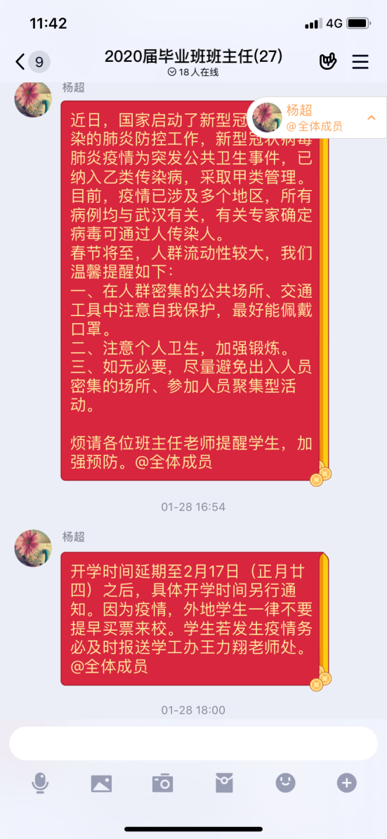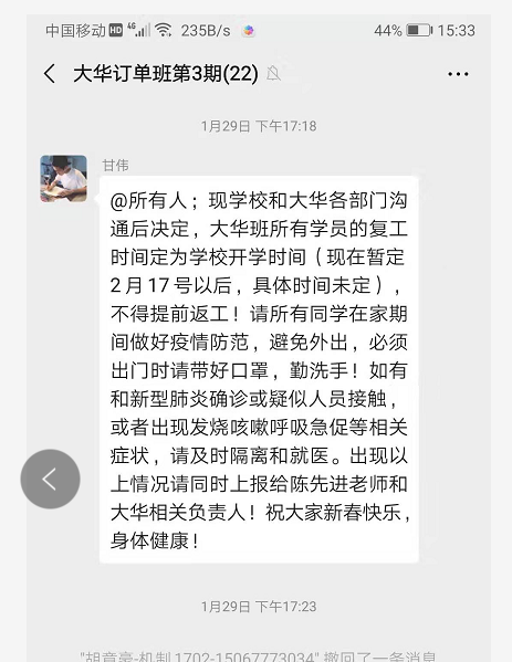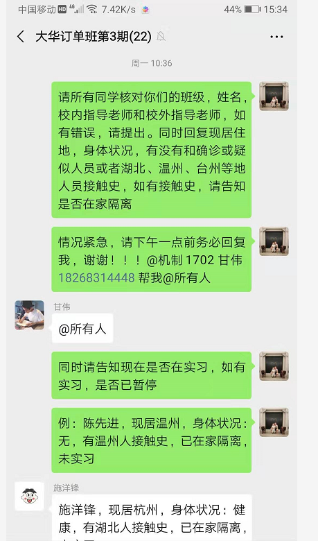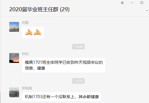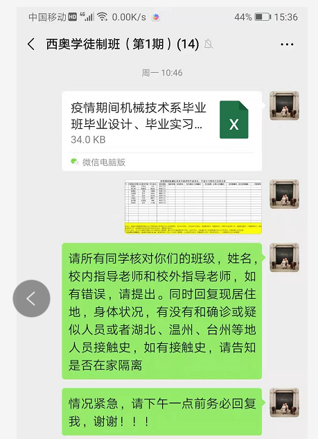 关注毕业生顶岗实习情况,毕业设计指导老师通过QQ群、微信群等平台,排查学生实习情况,落实疫情期间不安排学生实习的要求,保障学生安全。针对西奥现代学徒制班中在值班的三位同学,主动联系西奥单位负责人和学生,及时暂停实习。针对将要上岗的学生,主动与学生和用人单位沟通,暂缓上岗时间至疫情结束后,确保我系所有学生在家自行隔离保护。