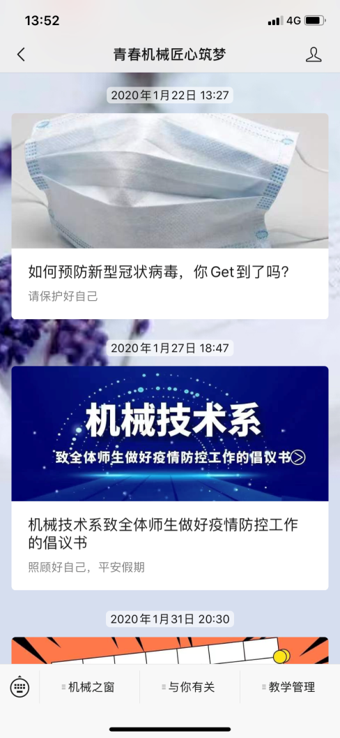 1.机械技术系学工线全体成员在系党总支的领导下,通过系网站、微信公众宣传,QQ群、微信群等多种形式开展新型冠状病毒的防治知识宣传。