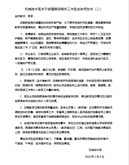 为进一步加强新型冠状病毒疫情防控工作,同时为确保即将开始的教学工作顺利进行,机械技术系在系党总支的领导下,坚决贯彻落实学院党委、行政和防控新型冠状病毒感染的肺炎疫情工作领导小组的统一部署,全体教职工勠力同心,攻坚克难,将各项工作落到实处。