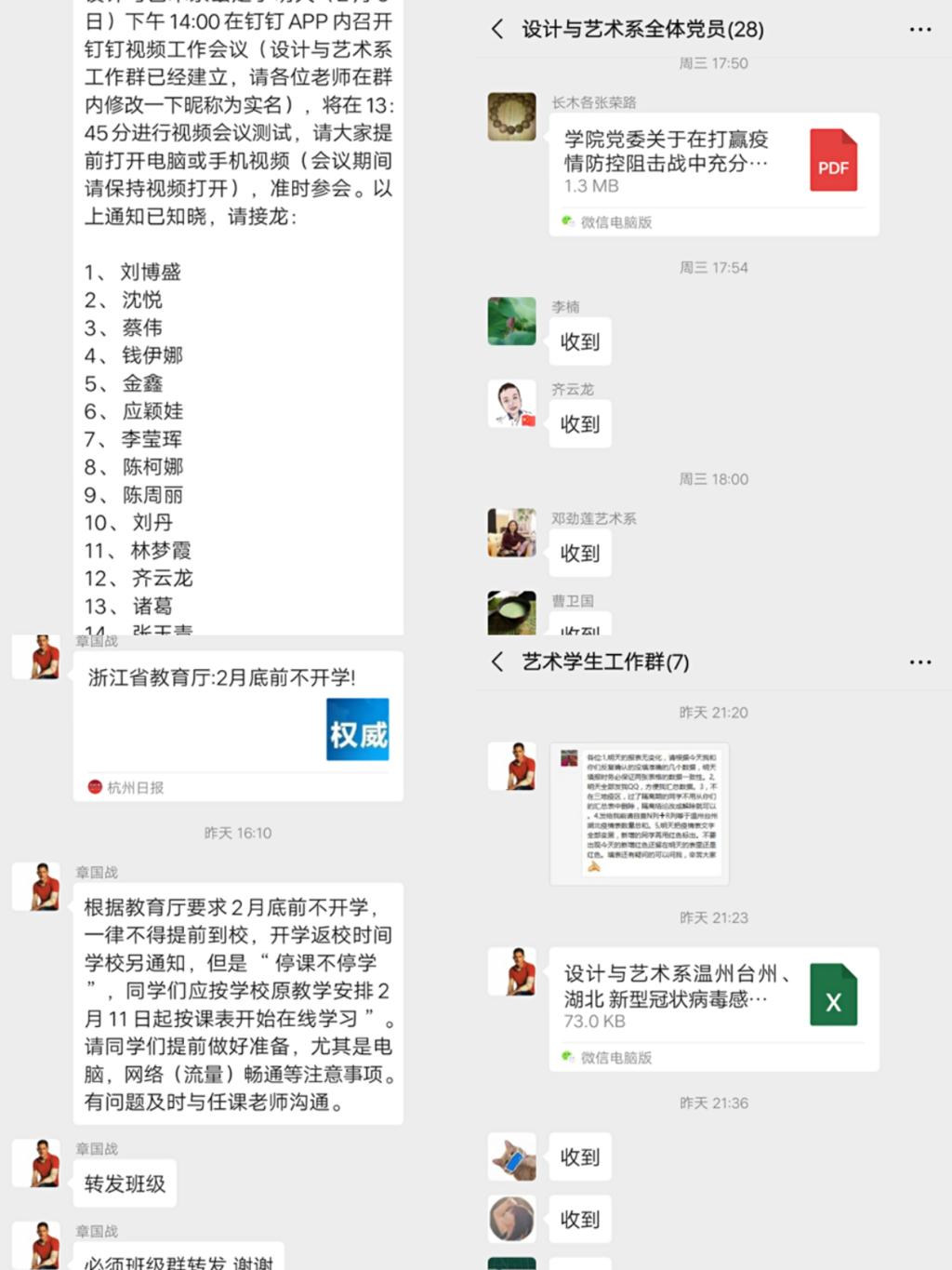 四、早准备,充分利用自媒体、互联网+技术做好春季延迟开学期间的教学准备工作。根据根据国家教育部、浙江省委省府、浙江省教育厅、浙江省机电集团公司及学院《关于做好2020年春季延迟开学教学相关工作的通知》等通知精神和要求,切实做好新型冠状病毒感染的肺炎疫情防控形势下“停课不停教、停课不停学”的要求,我系编制了《设计与艺术系2020年春季教学实施方案》,充分利用“互联网+教学模式”,推动信息技术与教育教学的深度融合,开展远程教育教学活动和学生学业辅导,确保学生学业需求和学习质量,最大程度降低疫情防控对新学期教学工作的影响。